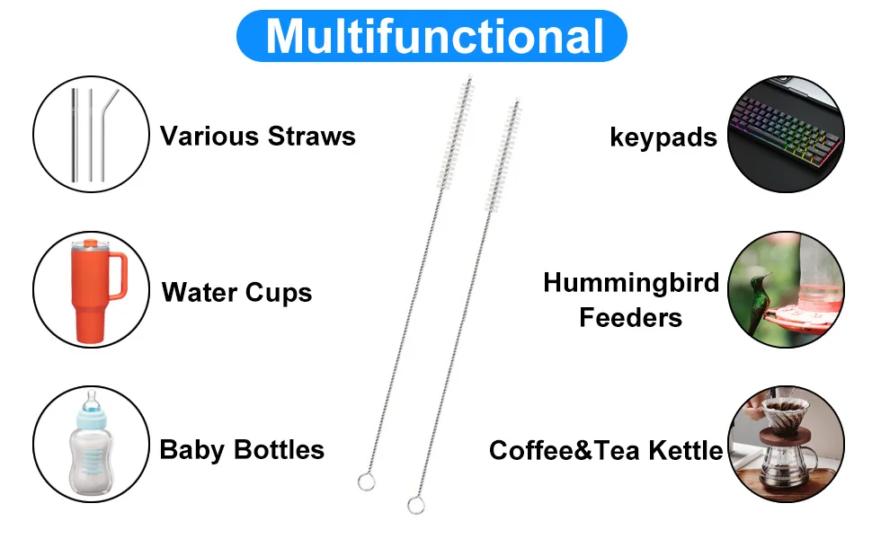 Easy to Use -These straw cleaning brushes are very easy to use. Simply insert them into the pipe, rotate, remove and clean. It can be used repeatedly and will not wear out or break. - Versatile - These straw brushes can be used not only for straws, tubes, pipes and all narrow-necked bottles of all materials, but also for cleaning narrow tubes, fans, coffee pots, sink drains, hummingbird feeders and other hard-to-reach corners and holes.